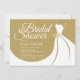 Um chá de panela chic com um elegante vestido de noiva em um fundo dourado com belos textos brancos e todos os seus detalhes especiais de chá de panela personalizados em texto branco chico. O inverso apresenta uma cor de fundo correspondente a um padrão de bolinhas. Você pode personalizar a cor de fundo tanto na frente quanto no verso para coordenar com seu tema de casamento.