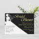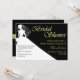 Chá de panela elegante feito em preto e branco, com uma silhueta branca de noiva contra fundo preto. O texto gráfico de tom Dourado lê Chá de panela. Todo o texto abaixo, em ouro amarelo e preto, está pronto para personalizar o seu evento noivo. O convite adorável que a noiva vai acalmar com todas as suas manobras de casamento.