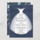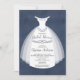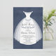 Chá de panela moderno de noiva com um lindo vestido branco de noiva colocado sobre um fundo azul-marinho escuro de cor d'água. Sacudir o convite para o chá de vestimenta de chic e na moda para ver um floral azul de aquarela correspondente para um toque especial extra. Convidar chá de panela contemporâneo para um chá de panela, chá de panela de verão, chá de panela de outono ou chá de panela de inverno. Visite nosso compro para ver esta design popular de noiva em várias cores.