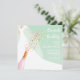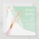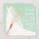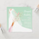 Os convites de chá de panela de Brunch e Borboleta apresentam uma noiva no seu vestido e véu sobre um fundo verde da casa da moeda com uma garrafa rosa de vinho espumante, flauta de vidro e sequências de faux com seus detalhes em letras brancas quicas. **DICA: O tamanho quadrado REQUER POSTAGEM EXTRA. CORRESPONDENTE a itens na nossa coleção.