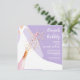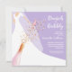 Convites de chá de panela de Brunch e Bubble apresentam noiva no seu vestido e véu em fundo de lavanda com uma garrafa de champanhe, sequências de vidro e faux e seus detalhes em letras brancas chic. **DICA: O tamanho quadrado REQUER POSTAGEM EXTRA. Mais cores na nossa coleção.