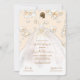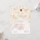 Linda mão desenhada como noiva de aquarela com cabelo castanho e pele escura em seu vestido de noiva e cercada por magnólias e brilho. A parte de trás do convite mostra anéis de casamento na caixa com noiva e iniciais de noiva.