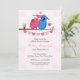 Um chá de panela giro com coruja rosa e coruja azul com rosa em pé no galho com corações. O fundo tem um padrão cardíaco rosa macio.