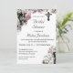 A design apresenta as imagens elegantes de rosas cor-de-rosa macio e híbridos brancos à medida que os curtiam. Imagem de um crucifixo prateado é apresentada no topo direito, assegurando aos seus convidados que esta é uma celebração católica. Seu texto é exibido em uma linda fonte de cor prateada; evento e nome de convidado de honra são apresentados em uma elegante fonte Nupcial. Projetado para coordenar com a "Coleção de Chás de panela Católica Elegante".
