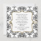 Chá de panela elegante feito em forma quadrada, com design de damasco preto e branco como fundo. Gráficos bonito de um campo de texto branco enquadrado com tom dourado, no centro, com texto preto personalizado. Personalize o texto do seu evento noivo. O convite adorável que a noiva vai acalmar.