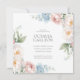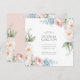 Elegante Chá de panela botânico com decoração de flores macios, azuis e rosa e folhagem elegante e verde nas esquinas. Os detalhes do Partido da Sua Marca e o nome do seu Convidado de Honra são apresentados elegantemente numa fonte de serifa de chic