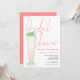 Seus hóspedes saberão que estão em um momento divertido com este design moderno com chá de panela em um roteiro de na moda em coral e um coral correspondente do outro lado. Um coquetel com folhas de menta é pintado no fundo à esquerda, com a tipografia se sobrepondo ligeiramente. Personalize facilmente os detalhes. Você também pode alterar as cores do texto e do plano de fundo em ambos os lados, se desejar através da opção Personalizar mais.