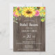 Chá de panela com girassóis em cascata em amarelo, rosa e verde sobre fundo de madeira. O verso do convite tem o mesmo fundo de madeira de aquarela.