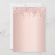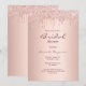 Na frente: um fundo de falso ouro rosa. Decorado com rosa dourado, pingos cor-de-rosa, pintura com aspecto pingado. Modelos para o nome da noiva e detalhes da festa. O nome e o texto: Bridal são escritos com um estilo escrito à mão, letras pretas coloridas. Traseira: fundo rosa dourado com gotejamento falho.