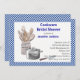 chá de panela de cookware de Na moda. gráficos de cookware decoram o lado esquerdo do convite, com uma borda azul e branca marcada ao redor de todo o convite. Personalize todo o texto para se adequar ao seu evento especial. Adorável convite para que a noiva seja amada.