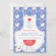 Este convite do chá da cozinha caracteriza um mitene branco ambos do avental e do forno embellished com corações vermelhos. O fundo é um impressão floral vívido em um fundo azul. Um excelente convida para sua celebração.
