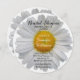 Chá de panela redondo, com um fim acima da fotografia de uma flor branca e amarela da margarida, contra um fundo branco. Personalize o texto para seu evento nupcial.