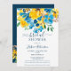 Um elegante, rústico primavera e girassóis amarelos de verão, rosas azuis e verde deixam chá de panela floral de aquarela com e elegante letra de pincel de guiamento. Perfeito para uma noiva de menina, na moda, ser celebrada!