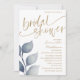 Modelo moderno e simples do chá de panela. Apresentando uma ilustração de folhagem em negrito com uma coloração d'água sobre um fundo branco com as palavras 'Chá de panela' numa fonte escrita à mão em ouro. Fácil de personalizar com suas próprias informações.