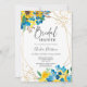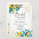 Chá de panela floral de ouro moderno, perfeito para primavera, verão com bonito azul, girassóis amarelos, rosas e folhas verdes com um quadro geométrico dourado, borário de terrário e dourado confetti e uma tipografia de fontes elegante.