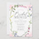 Este elegante chá de panela de flor silvestre apresenta flores pintadas manualmente com cor d'água com fundo rosado poeirento. Lindas flores doces de ervilhas, lavanda, coração sangrando, flores silvestres amarelas e cor-de-rosa em forma de coroa. A letra moderna do script de caligrafia adiciona uma tendência a este convite exclusivo de chás de panela. Edite você mesmo este modelo de convite!