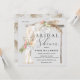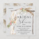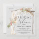 Chá de panela maravilhoso apresenta arco de boho de casamento com muslin draping e adornado com flores tropicais, protea e pampas.