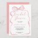 Celebre o estilo da noiva com este chá de panela cor-de-água rosa com um arco charmoso inspirado em coquetes e design de fita com elegante caligrafia pastel rosa. Perfeito por adicionar um toque elegante e feminino ao seu evento especial, este convite é ideal para temas românticos, pastéis e de chá de panela chique. Personalize com os detalhes do evento para torná-lo exclusivamente seu e crie uma primeira impressão memorável para seus convidados.