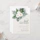 Celebrar a noiva com este chá de panela moderno e elegante, com um buquê floral tropical branco e verde feito de flores de hibisco e antourium, palmeiras e folhas de monstera, num arco colorido de pedra clara e com letra de guião assinatura.