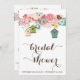 Ilustração de aves-vivas cor-de-rosa e castanho cercadas por flores brancas e coloridas e casas de aves enforcadas. Este convite será perfeito para chás de panela de verão e primavera.