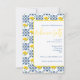 Este convite inspirado no azulejo mediterrânico azul, branco e amarelo-limão é perfeito para dar o tom do seu evento temático mediterrânico!