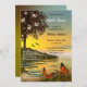 Chá de panela com uma pintura de uma cena costeira no pôr do sol com uma árvore romântica florescente e borboletas coloridas. Bonita para uma celebração na beira-mar ou com um tema de borboleta.