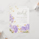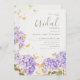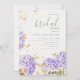 Modelo moderno, na moda, romântico de chá de panela com tema de borboleta, com flores de hidrangea roxas e pintadas manualmente, borboletas de aquarela em ouro e borboletas de ouro (este é um efeito digital, não uma folha real). Romântica e elegante, na moda e chic, vai apelar à noiva e ao noivo modernos que querem uma atmosfera refinada mas relaxada, talvez no campo, num jardim ou outro lugar onde a natureza tem um papel importante.