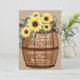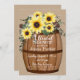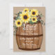 Belo buquê de girassóis no topo de um barril de vinho vintage, design de aquarela preenche todo este chá de panela por um convite divertido e festivo com texto de guião manual no barril de branco.