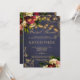 Um belo chá de panela rústico e tradicional / bridal, convite com flores de inverno buquês de burlões escuros, vermelhos vibrantes e rosas de marfim, e peônias, cordas de luzes cintilantes e um roteiro de caligrafia em ouro quente sobre um fundo azul escuro de marinho azul. ++++++++++++ O convite também é adequado para a noite de verão ou outono caírem no país rústico / quintal exterior / casamentos temáticos de fazendas.