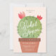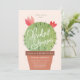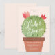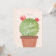 Um design branco de Stacey Meacham, com uma ilustração de cacto de cor aquosa desenhada à mão, com botões florais brilhantes, num pote de terracota.