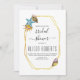 Poligão de folha de ouro e conchas de verão chá de panela de casamento de praia. Ele apresenta um quadro poligonal dourado com o seu texto e três marcas d'água em bege e azul no canto superior esquerdo e outro no canto inferior esquerdo. O dorso é de cor azul sólida.