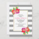 Bonito chá de panela de casamento moderno e chic exibindo flores tropicais cor-de-água rosa e roxa, uma fronteira feita de cinzas e listras brancas e seu texto em um quadro branco. O dorso é coberto com um padrão riscado em cinzas e branco.