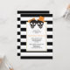 Os elementos deste chá de panela moderno de Halloween são um casal preto divertido com um arco laranja e um chapéu emparelhado com uma elegante borda preta e branca. Seu texto está em um quadro branco com contorno de ouro.