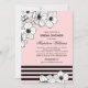 O elegante e belo design chá de panela apresenta uma borda floral orgânica de anêmonas pretas e brancas, acentuadas por faixas pretas horizontais cônicas em fundo de rosa claro balé. Personalize os convites com texto personalizado.