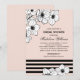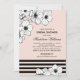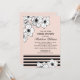 O elegante e belo design chá de panela apresenta uma borda floral orgânica de anêmonas pretas e brancas, acentuadas por listras pretas horizontais cônicas sobre um fundo cor-de-rosa pincelado. Personalize os convites com texto personalizado.