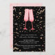 Convites de brida e borbulhante com dois copos cor-de-rosa de champanhe num fundo preto com confete cor-de-rosa e dourado, perfeito para um chá de panela de casamento. CORRESPONDENTE a itens na nossa coleção.