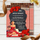Um chá de panela romântico com tema de CHURRASCO, com madeira rústica, quadro-negro, pintura vintage de uma mulher de vestido vermelho, flores de papoila e rendas sobre fundo de gingham. O dorso é uma combinação de madeira rústica com rendas em um padrão vermelho e marfim de gingham.