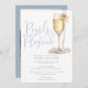 Este elegante script azul empoeirado pérolas e chá de panela prosecco podem ser personalizados com todas as suas informações especiais de evento e código QR de foto e registro no verso. Projetado por Thisnotme©