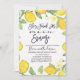 Chá de panela de aperto de citrinos Este chá de panela de coroa de limão apresenta uma caligrafia de pincel em preto e uma fruta de limão e uma coroa floral. A parte de trás do convite é uma imagem de lavagem com aquarela amarela com um pequeno padrão de ponto. Esta é uma design doce e uma maneira adorável de convidar convidados para um chá de panela.