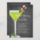 chá de panela moderno com um copo vermelho de martini com uma vadia e uma cana-de-açúcar em um fundo de chalkboard popular e tradicional. Na moda chá de casamento convida para um inverno, Natal, chá de panela de férias.