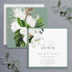 Chá de panela quadrado moderno, elegante, com um buquê de orquídeas brancas e proteas, e verde botânico tropical, bordado em verde-pálido de eucalipto. Personalize os detalhes do seu chá de panela em preto suave, acentuado com uma bela caligrafia manual moderna. A parte traseira da placa apresenta um buquê tropical embebido sobre uma textura verde pálida correspondente. Copyright Elegant Invites, todos os direitos reservados.