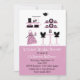 Chá de panela divertido feito em rosa, preto e branco. Gráficos de acessórios de cozinha decoram a parte superior da frente do convite, com um rosa sólido, na parte inferior. A parte de trás é feita em preto com bolinhas brancas em negrito. Texto branco e preto, na frente está pronto para personalizar o seu evento noivo. Excelente convite que a noiva amará.