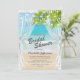 Convites de chá de panela com temas da praia tropical apresentando um cenário oceânico de verão, cortinas elegantes de seda, folhas de palmeiras, luzes cintilantes e modelo de festas noivas modernas que é fácil de personalizar.