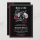 Esta design penetra um gótico crânio metálico floral "Bride or Die" do Halloween com flores vermelhas, pretas e brancas, em volta do crânio gótico preto. Este cartão é facilmente editável com os seus detalhes pessoais.