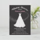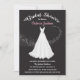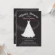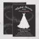 Bonito lugar branco de focagem suave e vestido de casamento de chiffon com espirais de estrelas em Convites de chá de panela pretos de fundo. Pode mudar todos os textos e cores sob a expressão "chá de panela"