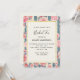 Um chá de panela com um belo padrão com flores bonito cor-de-rosa sobre um padrão listrado composto por listras azuis e creme. Um quadro retangular com uma borda falsa de folha de ouro colocada sobre cima com o seu dentro de texto personalizado.