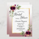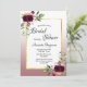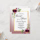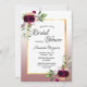 Na frente: Um rosa de canela, fundo de gradiente branco com uma falso estrutura dourada. Decorados com flores escuras e burgosas, rosas, penas e verde ao estilo do bô. Modelos para o nome da noiva e detalhes da festa. O nome e o texto: Chá de panela são escritos com um script de estilo manuscrito, letras pretas. Fundo: fundo de gradiente de rosa de canela.