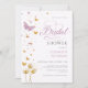 Um chá de panela elegante com tema das borboletas, com três dandéliões e um enxame de borboletas em ouro (efeito digital, não ouro real), com uma borboleta roxa, com depoimento ao lado da palavra "bridal", em elegante caligrafia moderna com florescimento feminino. Com sua delicada e caprichosa natureza, as borboletas sobre as lindas flores silvestres apelarão à noiva moderna que gosta de estética feminina e romântica. Símbolos de transformação, novos começos e crescimento, são um motivo perfeito para um chá de panela de elegância e luxo. Uma design visualmente agradável e bonita para um evento sofisticado e clássico de uma noiva.