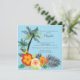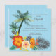 Comece seu chá de panela tropical com nossas impressionantes flores de hibisco laranja e convites de chá de panela de palmeiras. Nosso chá de panela tropical na moda é colocado sobre um fundo azul de cor azul claro para realmente fazer elementos de convite pop e tem uma coordenação de volta.
