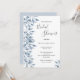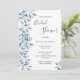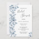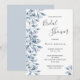 Um Chá de panela de tendência em branco e azul empoeirado. Um fundo branco chic na frente. Decorados com prigos e folhagem azuis botânicos. Escrita moderna e extensa, tipografia com texto: Chá de panela. Modelos para o nome da noiva e detalhes da festa. Texto das cinzas escuras. Fundo: fundo azul empoeirado.